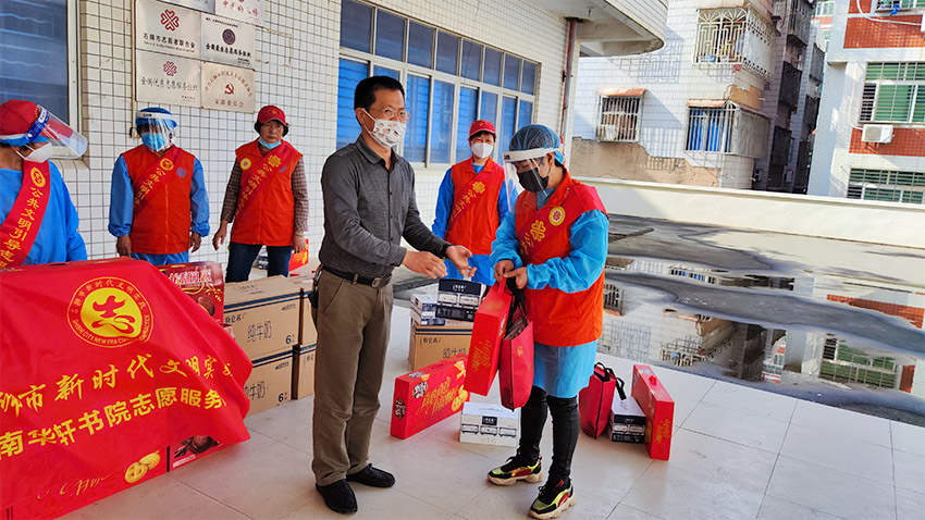 本报讯4月21日下午,爱心企业永佳食品商贸有限公司、石狮市南华轩书院负责人前往市公共文明劝导志愿者协会开展慰问活动,感谢他们为疫情防控工作作出的贡献,并为志愿者们送去牛奶、饼干、口置、湿纸巾等食品和防疫物资。