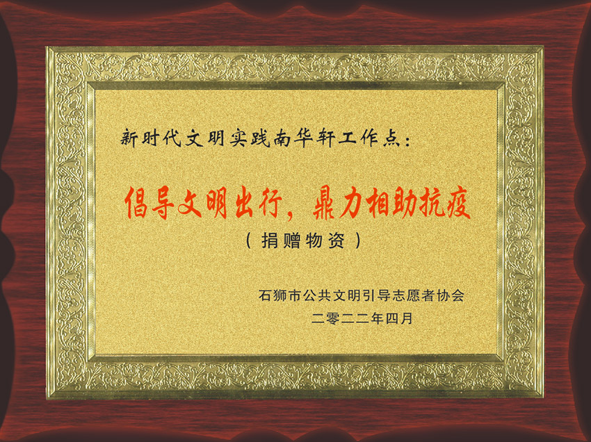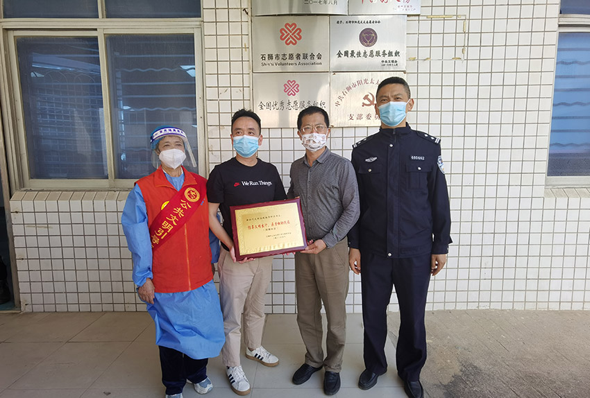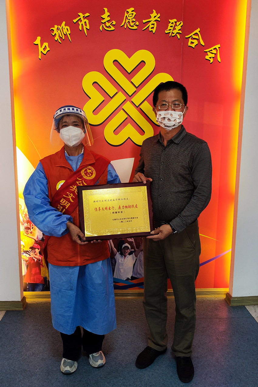 石狮市公共文明劝导志愿者协会负责人连秀凤对爱心企业的慰问表示感谢,并回赠了—块写有“倡导文明出行鼎力相助抗疫”的牌匾作为答谢。